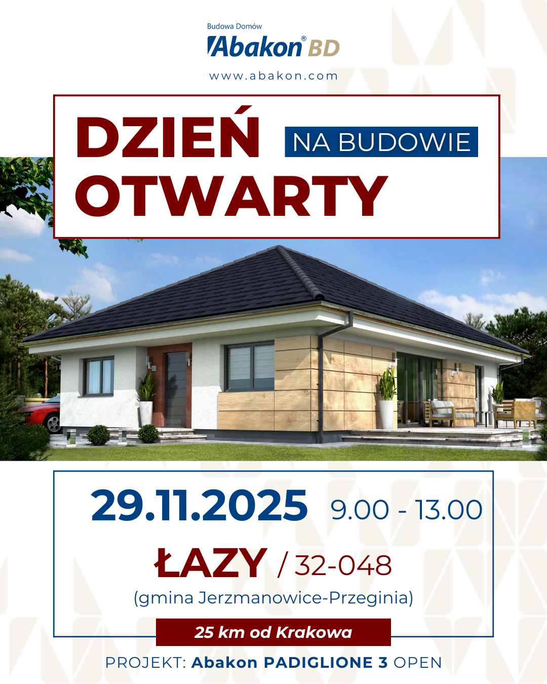 29 listopada 2025 r. zapraszamy do miejscowości ŁAZY, (32-048, gmina Jerzmanowice-Przeginia), 25 km od Krakowa. Pokażemy dom z keramzytu, według projektu: Abakon PADIGLIONE 3.
