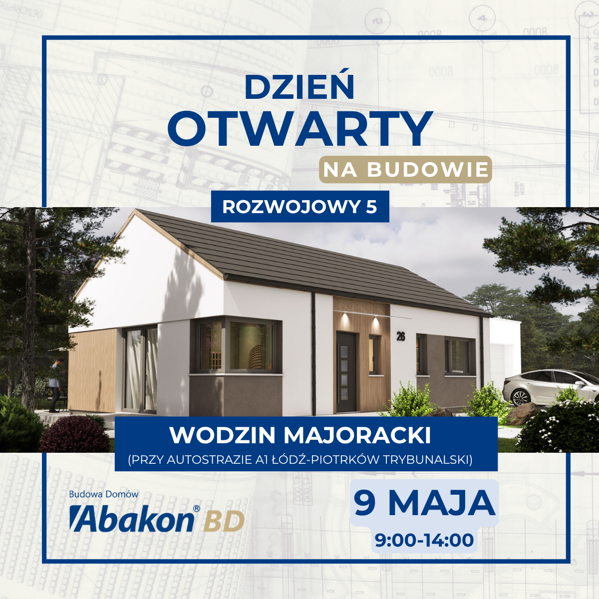 9 maja 2026 r. zapraszamy do miejscowości WODZIN MAJORACKI, przy autostradzie A1 Łódź-Piotrków Trybunalski (woj. łódzkie), gdzie pokażemy dom z keramzytu, według projektu: Abakon ROZWOJOWY 5.